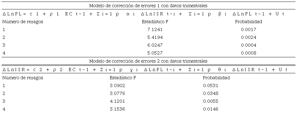 Las pruebas de causalidad en ambiente de cointegración son reportadas en la Tabla 8. Se puede observar que independiente del número de rezagos, el ISR causa la productividad del trabajo. No obstante, la no causalidad desde la productividad laboral hasta el ISR no puede ser rechazada, al menos en los rezagos de orden dos, tres y cuatro. Si bien esto no contraviene los resultados antes encontrados, introduce la posibilidad de que en datos trimestrales la causalidad sea bi-direccional.
