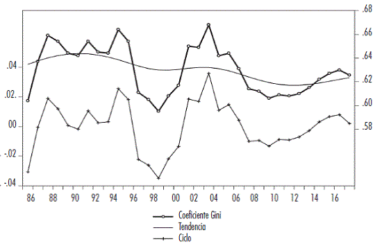Existe un persistente comportamiento cíclico de la desigual DIP. La figura 1 muestra la evolución del coeficiente Gini en el periodo 1985-2017, cuyo valor oscila entre 0.59 y 0.67, con periodos de aumento y otros de reducción y con un promedio anual de 0.63, lo que implica que Perú presenta una desigual di muy superior a países de dinámico crecimiento como son Corea del Sur y Taiwán (0.28 y 0.38, respectivamente, según Korzeniewicz y Moran, 2005).