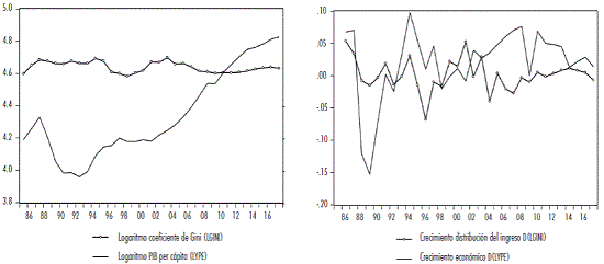 Se observa que el coeficiente de Gini oscila alrededor de su media de 0.63, con una tendencia decreciente y es integrada de orden cero, I(0). Asimismo, el nivel de PBI per cápita oscila alrededor de su media de US$3 979, y es integrada de orden cero I(0), y presenta una tendencia decreciente en el periodo 1987-1992 y una tendencia creciente en el periodo1993-2017.