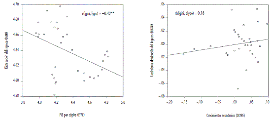 La Figura 3A muestra la correlación negativa y estadísticamente significativa en niveles entre LGINI y LYPE (r=-42%). La Figura 3B en tasas de crecimiento presenta una asociación positiva y estadísticamente no significativa entre DLGINI y DLYPE (r =18%).