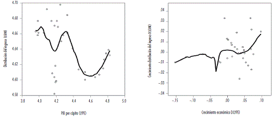 En la Figura 4 A y 4B se observa la relación dinámica entre el PBI per cápita y Gini en niveles y tasas de crecimiento, indicando que más que HUK, parecería habría una curva W, de la desigual DIP (HCW) asociada a los ciclos de crecimiento económico no sostenido y desigual DIP.