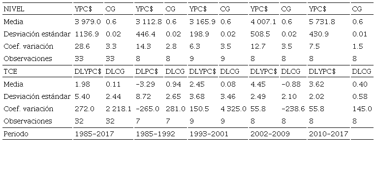 La Tabla 1 muestra estadísticas descriptivas de las dos variables relevantes para cuatro periodos de análisis. Se identifica -como hechos estilizados- que la economía peruana, en el periodo 1985-2017, presenta un relativo bajo ingreso per cápita promedio anual de US$3 979, mientras que el coeficiente de Gini fue 0.63, mostrando que existe una desigual DI, y observando además que el ingreso per cápita por su coeficiente de variación (28.6) fue mucho más volátil que Gini (3.3). Asimismo, las volatilidades se reducen paulatinamente para ambas variables tendiendo a mejorar la DIP, excepto el periodo de bonanza por exportación de RR.NN. (2002-2009), en el que paradójicamente se incrementó el nivel PBI per cápita y empeoró la DIP, contrario a lo observado en la mayoría de los países de AL en dicha década.