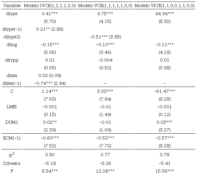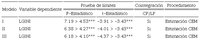 Los resultados sugieren que las variables en primeras diferencias son estacionarias y se pueden aplicar modelos de estimación ARDL. En la Tabla 2 se observa el análisis de cointegración de los modelos con la prueba de límites. Se muestra la existencia de una relación de cointegración a largo plazo para los tres modelos.