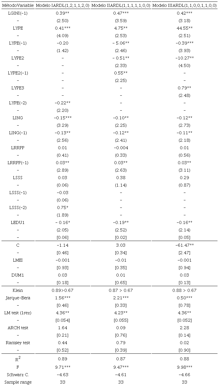 En la Tabla 3 se presentan los resultados de la estimación del modelo ARDL a partir de la ecuación (2). En el modelo I existe evidencia de una relación causal directa del PBI per cápita a DIP, siendo significativo estadísticamente al 1%. En el modelo II se contrasta HUK, cumpliendo con los signos esperados y estadísticamente significativos. Sin embargo, al estimar el modelo III se obtiene un caso especial de la curva en forma de W No se cumple con HUK, lo que permite inferir que la curva W (HCW) refleja a la economía peruana con un lento y no sostenido crecimiento económico, con bajos niveles de capital humano y débil institucionalidad que genera la desigual DIP en forma cíclica.