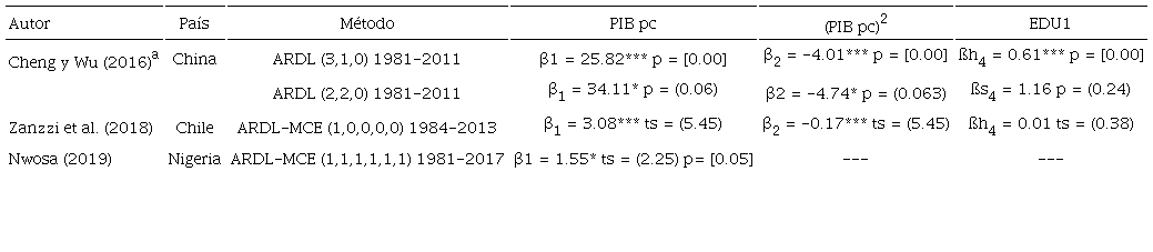 Nwosa (2019) estima un modelo ARDL con un modelo lineal y el coeficiente del PBI per cápita es 1.15 estadísticamente significativo al 10% para Nigeria, en comparación al modelo básico estimado que logra 0.41 al 1% de significancia.