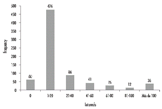 La generación de patentes por entidad federativa observa un comportamiento asimétrico y concentrado en intervalos inferiores de la distribución (véase Figura 1). En el rango de 1 a 20 solicitudes se ubica 65% de los casos, mientras el nivel superior, mayor a 100, sólo se observa 4.9% de los registros totales.