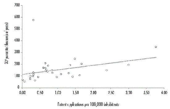 La evidencia empírica reciente que confirma estas ideas es abundante, tanto internacional como regionalmente. Bilbao-Osorio y Rodríguez-Pose (2004) analizan dicha conexión en una muestra de países de la Unión Europea. La innovación, medida como el número de solicitudes de patentes por cada millón de habitantes, genera efectos positivos que varían en función del nivel de desarrollo de los países. Igual resultado demostró Ulku (2004) en dos ejercicios sobre países miembros y no miembros de la OCDE. A partir de un modelo de panel dinámico estimado por el método general de momentos (GMM) de Arellano-Bond, para el periodo 1981-1997, la autora encuentra que las innovaciones (solicitudes de patentes) tienen impactos positivos en el PIB per cápita de ambas muestras. Entre los resultados destaca que el tamaño del mercado y el nivel de ingreso se asocian positivamente con la innovación. Al centrar la hipótesis en cuatro sectores de la manufactura, en 17 países de la OCDE (México incluido), Ulku (2007) llega a resultados similares.