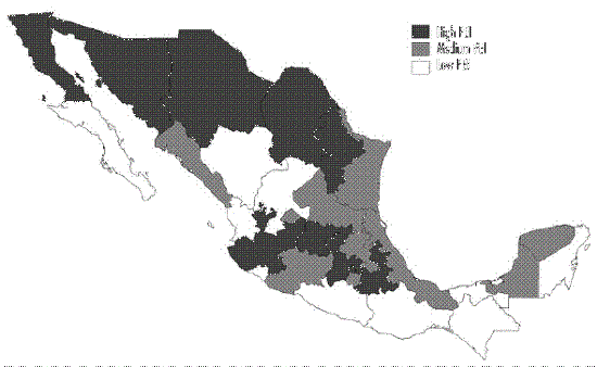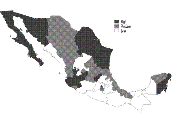 En las Figuras 3, 4 y 5 se clasifican los estados del país con base en los criterios de regionalización macro definidos previamente. La concentración de los niveles más elevados de ingreso y recursos ejecutados dentro del PEI se da en el norte del país, la Ciudad de México, Jalisco y Querétaro, principalmente.