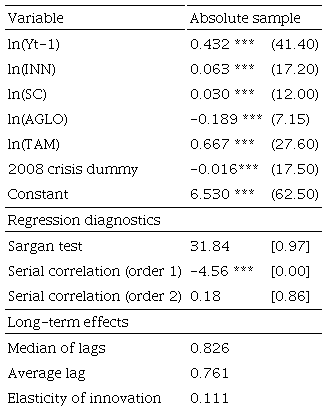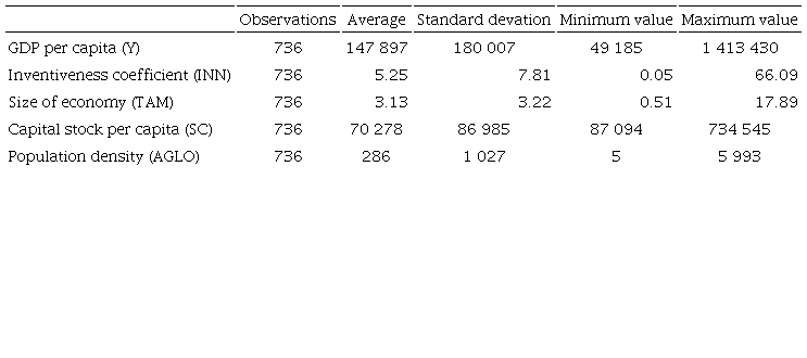 donde PIBpc es el ingreso per cápita, INN es la medida de innovación, AGLO es el índice de aglomeración, SC es el stock de capital y TAM es el tamaño relativo de las economías.
