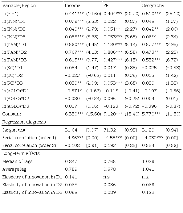 Los resultados basados en regiones con pei muestran que el efecto de corto plazo de la innovación sobre el ingreso per cápita es muy similar en las regiones PEI-Medio y PEI-Bajo, ligeramente superior al 0.05%. En consecuencia, el multiplicador de largo plazo de estas regiones también es semejante: un incremento sostenido de 1% en el coeficiente de inventiva aumentará en 0.09% el ingreso per cápita de las entidades de estas dos regiones. Los resultados de esta regionalización sugieren que el PEI jugó un papel decisivo en el efecto que tiene la innovación sobre el ingreso estatal, aunque fue no significativo para el grupo de entidades que ejercen más recursos dentro del programa, esto puede suceder porque posiblemente muestran una mayor cercanía a la relación de equilibrio.