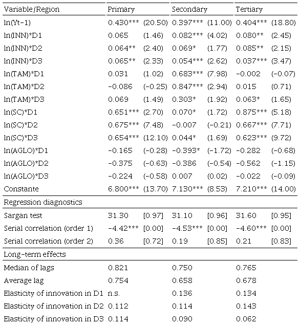En los resultados por región geográfica, la elasticidad entre innovación e ingreso per cápita es mayor en la región Sur (0.06%) que en el Centro (0.042%), mientras en el Norte, aunque más elevada, fue no significativa. Estas diferencias de corto plazo explican que el efecto de largo plazo también es mayor en el Sur (de 0.12%) que en el Centro (0.09%). En sí, las intensidades de elasticidad parecen reflejar la condición de rendimientos decrecientes, cuanto más lejanos del crecimiento potencial, como sería el caso del Sur, existe un efecto mayor.