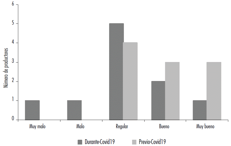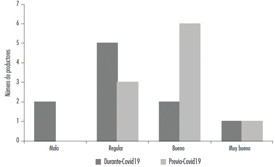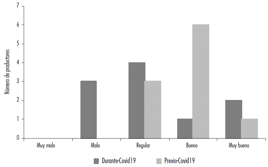En este mismo sentido, en torno a las afectaciones por la emergencia sanitaria sobre elementos de la producción (véase Figura 1), es interesante mencionar que la percepción en torno a la disponibilidad y acceso a materias primas (semilla, abonos, fertilizantes o sistemas de riego) ha cambiado hacia una percepción más negativa, pasando de ser considerada como "Buena" o "Muy Buena" para 70% de los consultados (7 de 10 productores) a 30% (3); de "Regular" 30% (3) a 50% (5), y a considerarse "Mala" en 20% (2).