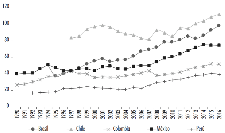 Otro elemento importante es el volumen de las deudas con respecto al producto, denominado profundidad financiera, mismo que refleja la complejidad financiera de un país. La profundidad financiera se mide a través de los agregados monetarios, específicamente, mediante la diferencia M4 y M14 dividido por el PIB. Se omite la medición de la profundidad financiera de Argentina por los periodos especiales como el "régimen de convertibilidad" que rigió entre 1991 y 2001 (véase Pierre-Manigar, 2009), y las políticas proteccionistas del kirchnerismo. Un elemento común es el crecimiento de la profundidad financiera (definido en la nota pie 7) que se aceleró después de la CFG-2008. Ese es el caso de Chile, Brasil, México y, de manera menos acentuada, Colombia y Perú (véase Figura 1) resaltándose que la aceleración del monto de las deudas se debió a factores externos, explicados por los influjos de capital externo.