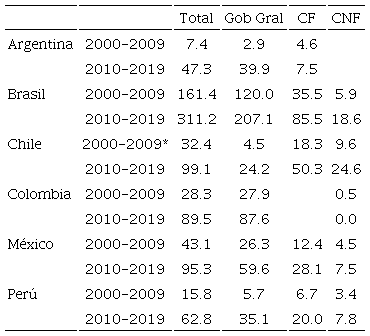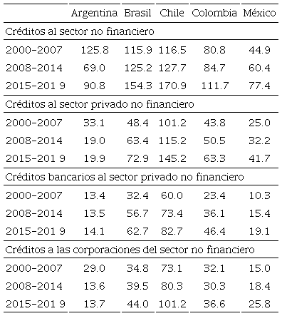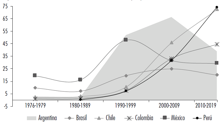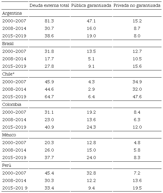 En Argentina, Brasil, Chile y Perú, la deuda externa tiene un peso mayor sobre todo en las primeras dos fases. Argentina, al inicio del nuevo siglo, tiene el mayor volumen de deuda externa, explicado por la crisis entre 1999-2001, con una importante participación del sector público (casi la mitad), que se origina por el default de la deuda pública en 2001 y que se reestructura en 2005) con baja participación de la deuda del sector privado. Se advierte que en Argentina en el periodo posterior a la CFG-2008, la deuda externa se reduce drásticamente, en particular la deuda pública, con una caída menor de la deuda privada, manteniendo esa misma composición en la fase 2015-2018. Brasil es un caso interesante que tiene una deuda relativamente menor que Argentina, aunque con una gran participación del sector privado, sobre todo, en el periodo de 2015-2018, pues buena parte de la deuda pública es de origen interno. Este fenómeno también aplica a Chile y Perú, con una deuda mayor a la brasileña, donde el sector privado es una fuente importante de la deuda externa. En Colombia y México la deuda externa es relativamente alta.