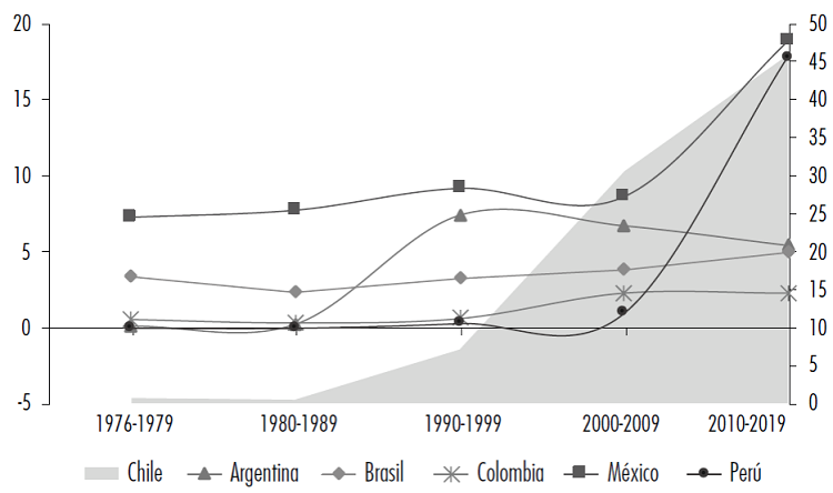 Finalmente, se analiza el mercado de bonos. La primera señal es que la emisión de bonos internacionales tiene una larga trayectoria en la región. En los años setenta y ochenta del siglo pasado, los países con mayores volúmenes de emisión de bonos internacionales fueron México, por la presencia de petróleo y el posterior gran endeudamiento externo, seguido por Brasil. En los años ochenta se suma Argentina a la emisión de bonos internacionales. En 1990 se acelera esa tendencia, explicada por al régimen de convertibilidad; y cae la participación de México y Brasil, por la firma del TLCAN y el dinamismo del mercado financiero doméstico, respectivamente. La emisión de bonos internacionales chilena y peruana se dinamiza en los años noventa, manteniéndose hasta la segunda década del siglo XXI. Incluso, en este último periodo, esas economías lideran la emisión de bonos internacionales respecto a su PIB (véase Figura 2a).
