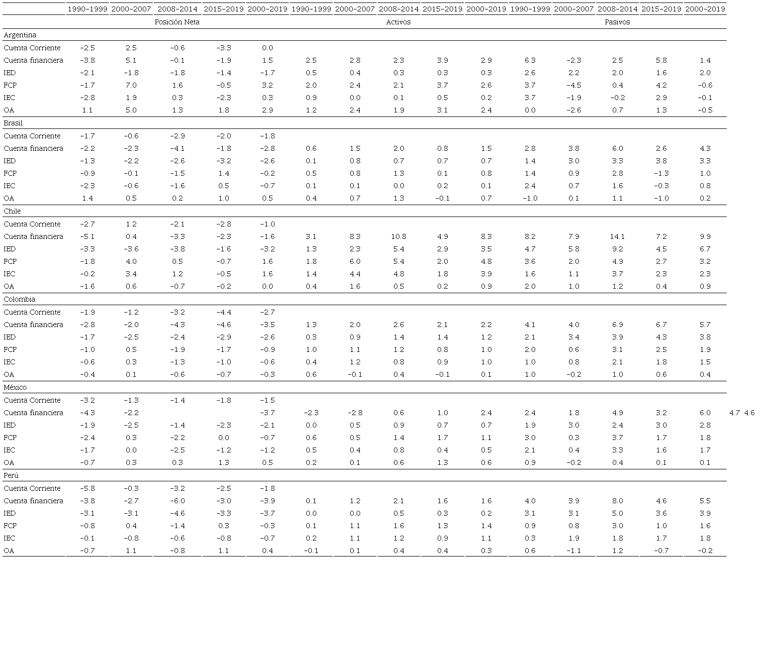 El punto de arranque del análisis es el movimiento de capital transfronterizo de las economías latinoamericanas (véase Tabla 1). Los elementos comunes en todos los países analizados son: primero, la condición deficitaria de sus cuentas corrientes externas, con excepción de la etapa de transnacionalización, explicada por el mejoramiento de los términos de intercambio de la región, revirtiéndose en el periodo posterior a la crisis de 2008; segundo, la entrada de inversión extranjera es superior a las necesidades de financiamiento de la cuenta corriente externa.