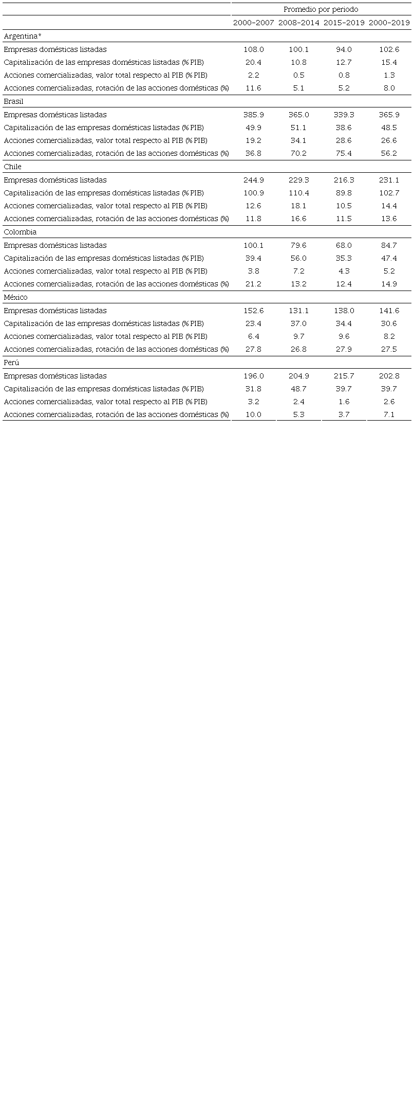 Otro elemento importante de la complejidad financiera es la evolución del mercado de valores (véase Tabla 3). Allí se observa una evolución inversa al flujo de capital externo por la reducida participación de la gran empresa extranjera en los mercados de capital locales, es decir, estas instituciones no participan en los mercados donde se hospedan, así como las grandes empresas de origen latinoamericano tienen una reducida participación en los mercados locales. El mayor número de empresas listadas se encuentra en Brasil, seguido por Chile y Perú (una economía relativamente pequeña), y luego México y Argentina. En términos del valor de capitalización respecto al PIB, Chile encabeza la lista, seguido por Brasil y Colombia. Perú se encuentra en un alejado segundo lugar, seguido por México y Argentina.