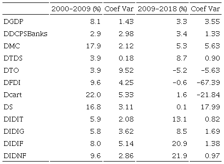 Del análisis de la Tabla 6 resalta el periodo 2009-2018. En esos años, la tasa de crecimiento de la rotación del mercado accionario (DTO), las acciones comerciadas (DS) y la tasa de crecimiento del PIB (DGDP) tienen una importante reducción respecto al periodo previo (de 8.1% en 2001-2009 a 3.3% en 2009-2018); el crédito de la banca comercial al sector privado (DDCPS-Banks) crece modestamente, mientras que la emisión de deuda-bonos en moneda extranjera crece de manera vigorosa, duplicándose la tasa de crecimiento promedio de la emisión de deuda en moneda extranjera de las instituciones financieras y no financieras (20.9 y 21.9%, respectivamente). En el mismo sentido, la tasa de crecimiento promedio del stock de endeudamiento externo se duplicó (pasó de 3.9% en 2000-2009 a 8.7% en 2009-2018). Finalmente, durante 2009-2018, la tasa de crecimiento de la entrada de capital disminuyó, presentando una gran volatilidad (coeficiente de variación de la IED -IFDI- y del capital de cartera -Dcart- fue de -67.39 y -21.84, respectivamente). En otras palabras, el segundo periodo se caracterizó por mayor volatilidad, menor crecimiento, y creciente endeudamiento externo, liderado por la colocación de bonos de la gran empresa no financiera.