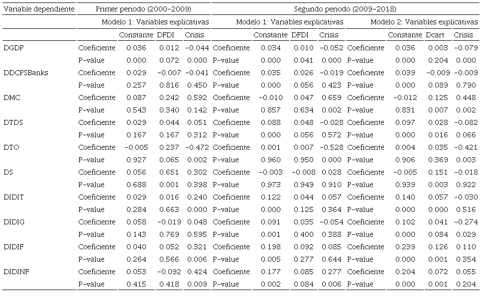 Se distingue que el coeficiente de la IED sobre el PIB cae del primer al segundo periodo y el rasgo relevante es que la IED (DFDI) y la inversión de cartera (DIEC) afectan positivamente la tasa de crecimiento del endeudamiento externo (DTDS). En el segundo periodo, la inversión de cartera dinamiza el mercado accionario (lo que se observa a través del coeficiente de DMC '0.125' y DS '0.151') y, a diferencia del primer periodo, la IED no promovió el crecimiento de dicho mercado (los coeficientes son no significativos), e incluso, el coeficiente de la IED sobre el nivel de DTDS fue superior al del crédito bancario al sector privado (DDCPSBanks) (0.048 versus 0.026). También se observa que la inversión de cartera dinamizó el mercado de bonos en moneda extranjera, principalmente, el de las instituciones financieras y no financieras (0.12 y 0.07%, respectivamente).