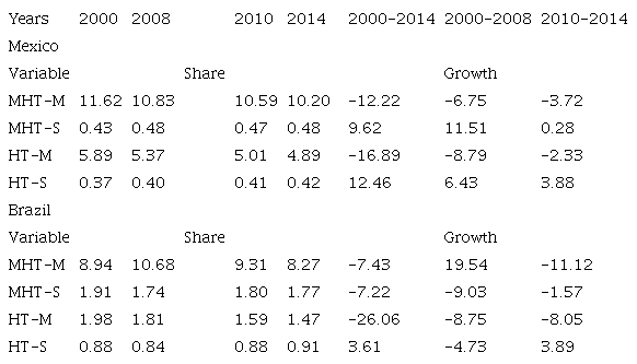 In Brazil, the MHT&HT industries (services and manufacturing) share fell from 13.7 to 12.4% between 2000 and 2014. MHT-M and MHT-S shares fall by approximately 7%, mainly in chemical products and electrical equipment. The HT-M share decreased 26% (see table 2), related to the degrowth of “Manufacture of basic pharmaceutical products and pharmaceutical preparations” and “Manufacture of computer, electronic and optical products”.