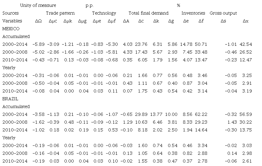 The final demand is the source of change that most contributed to the gross output growth between 2000 and 2014, with 106 and 110% growth for Brazil and Mexico, respectively (equivalent to 65.5 p.p. and 62 p.p, table 5 and 6). In this type of decomposition, it is natural that the final demand corresponds to the most significant share since it has the most considerable magnitude in terms of monetary units. In Mexico, exports and household consumption are the most critical final demand components of gross output growth (see table 5) between 2000 and 2014. For Brazil, household consumption and the GFCF represent the largest share of the demand contribution (see table 6).