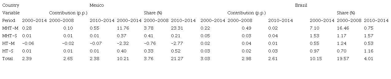 Regarding technological change, there is a positive contribution to gross output in Mexico for the MH&MT group in both sub-periods (see table 5), mainly related to MHT-M. The other sectors had a reduction in linkages.14 However, in the Brazilian case, it is only possible to observe an increase in relations between 2000 and 2008 (see table 5). Interestingly, only the MHT-M positively affected this sub-period, which predominated against the negative contribution to the MHT-S, HT-M sectors, and HT-S.
