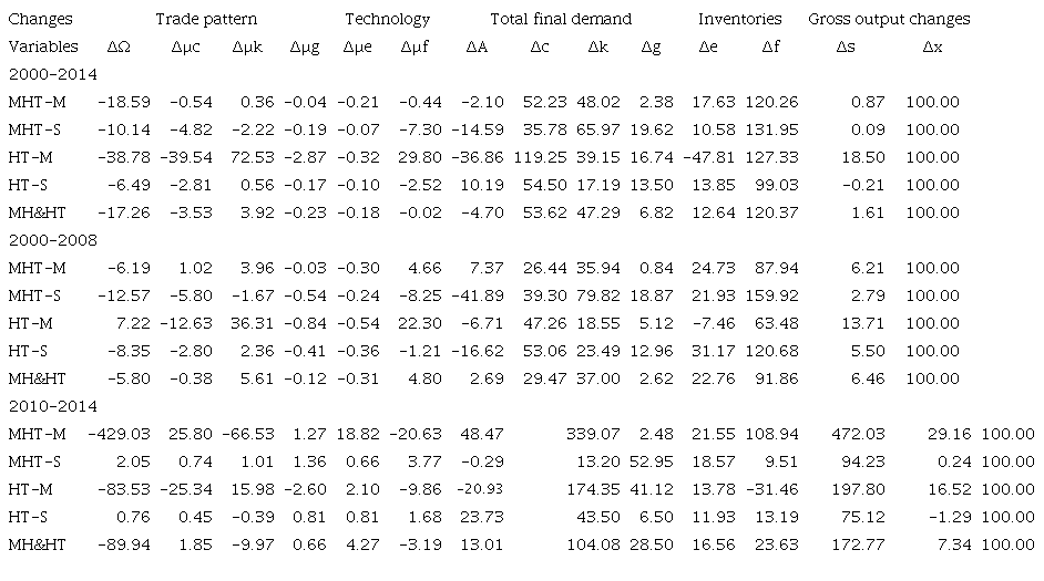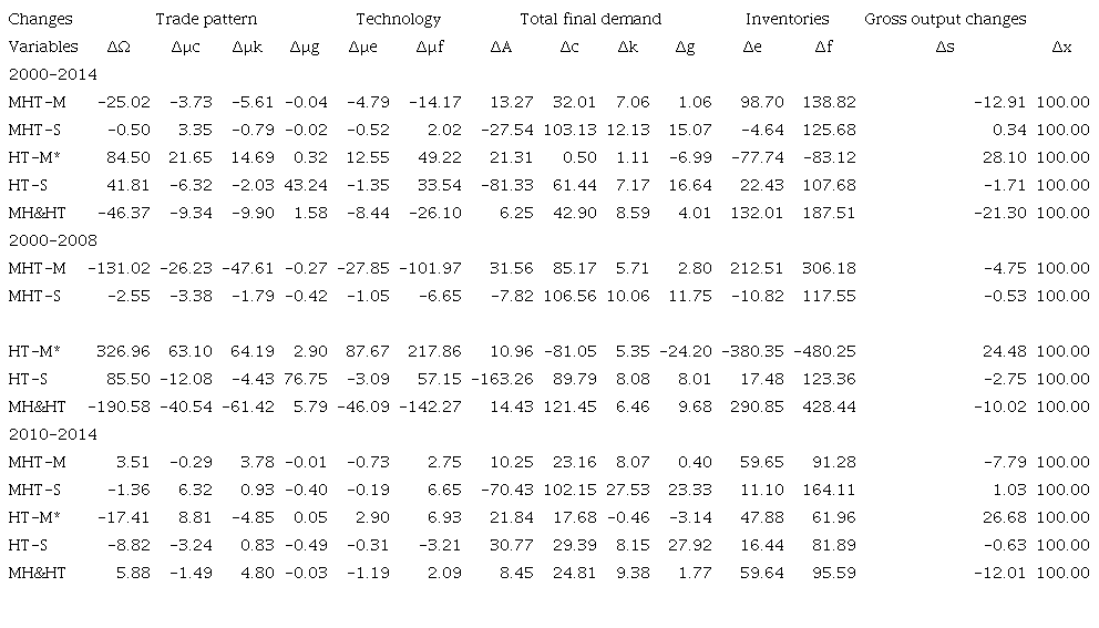To understand which factors are associated with changes in gross output, we analyze the SDA. We first show the SDA for the total gross output for Mexico and Brazil from 2000 to 2014 and two sub-periods: 2000-2008 and 2010- 2014 (see table 4). The annual rates are also presented in this table because the periods have different numbers of years. Also, we show three more tables to understand the SDA. Table 4 shows the sectoral contribution to the changes in gross output, both in percentage points and shares. Table 5 (Mexico) and table 6 (Brazil) show the sources of change to which this shift in the importance of the MH&HT group is related.