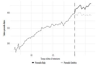 Es decir que el efecto de tratamiento es la diferencia entre la trayectoria observada de la unidad tratada y la trayectoria de la unidad sintética luego del periodo de intervención, siendo la unidad sintética el contrafactual de lo que hubiese sucedido si la unidad tratada no hubiese recibido el tratamiento. Una gran ventaja del control sintético es que permite mostrar empíricamente las diferencias existentes entre la trayectoria del grupo de tratamiento y del grupo de control. Un buen control sintético no debería mostrar diferencias en su trayectoria con la de la unidad tratada antes de que empiece el tratamiento.