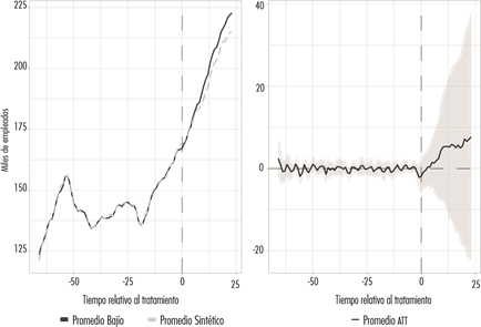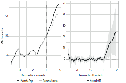 En la figura 2 se presenta la estimación para el empleo total. Se puede observar que el ajuste antes de la intervención es bueno, y a partir de allí se notan leves incrementos en la tendencia del ATT, que a su vez se refleja en la diferencia de las series del panel izquierdo. En el primer trimestre, tras el establecimiento de las nuevas automotrices, se habían creado al menos 4 700 empleos en promedio para cada entidad federativa del Bajío. Luego de cinco trimestres, el empleo promedio aumentó en 13 mil empleados, y al trimestre 10, esta cifra se posicionaba en 36 mil. El efecto creció rápidamente a partir del trimestre 8 hasta alcanzar un impacto que supera un promedio de 122 mil nuevos empleos para el último trimestre.