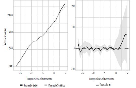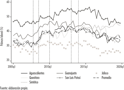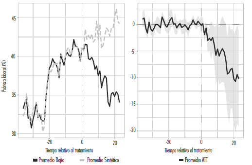 En la figura A6 del anexo se presenta el comportamiento de la pobreza laboral para los cinco estados tratados, junto con el promedio de la tendencia de la pobreza laboral para los estados que conforman el control sintético. La tendencia a la reducción de la pobreza en los estados tratados y el incremento notorio de este indicador para el grupo de control sintético en el periodo posterior al tratamiento confirma la validez de las estimaciones y otorga veracidad al efecto causal descrito anteriormente.