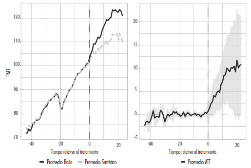 La estrategia econométrica consiste en un análisis de evaluación de impacto mediante el método sintético de control con adopción escalonada siguiendo la metodología de Ben‑Michael et al. (2021). Dicho método es una extensión al diseño de control sintético original formulado en el trabajo seminal de Abadie y Gardeazabal (2003) y, posteriormente, aplicado en Abadie et al. (2007) y Abadie et al. (2015). En su versión inicial, la metodología asume que se observa un conjunto de unidades antes y después de cierta intervención, en donde una de las unidades es expuesta a dicha intervención (tratamiento) y las unidades restantes constituyen un grupo de control. El control sintético se construye por medio de ponderaciones que logren minimizar el cuadrado de las diferencias entre las características de la unidad de tratamiento y de las unidades no expuestas en el periodo anterior a la intervención.