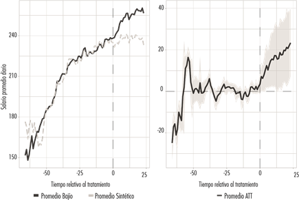 Los resultados se presentan de acuerdo a cada dimensión evaluada del de‑ sarrollo regional. Aunque el análisis del estudio se realiza a nivel estatal, por el potencial de datos municipales en los conjuntos de información del IMSS, se realizaron estimaciones a nivel municipal para las categorías de empleos y salarios. Las estimaciones se exponen por medio de figuras de dos paneles. En el panel izquierdo se muestran las tendencias observadas (serie negra) y sintéticas (serie gris) promedio para el Bajío en la variable de estudio. Por su parte, en el panel derecho se presenta el efecto de tratamiento promedio (ATT) de la variable estudiada (serie de color negra), junto al intervalo de confianza al 90% de la estimación (área sombreada de color gris). Para los resultados estimados a nivel trimestral habrá 66 periodos antes del tratamiento, y posterior a la intervención se evalúa el impacto por medio del ATT en 23 trimestres, el cual es el mismo periodo postratamiento de la última unidad tratada.