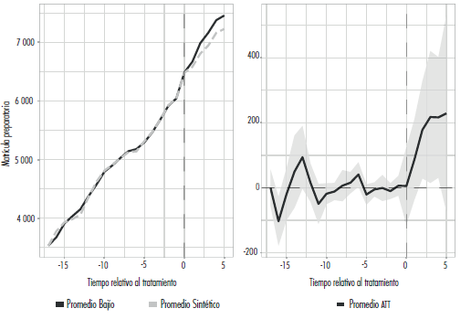 Ahora bien, observando la idea de que las plantas industriales pueden in‑ crementar la demanda de trabajadores de cierto nivel educativo en particular, se podrían esperar impactos en los registros de matrícula educativa de los habitantes en el Bajío. En el anexo se muestra que no hay efectos en educación superior. Sin embargo, sí existe un efecto para educación media superior (véase figura 7). En este sentido, es que gracias a las armadoras automotrices, una mayor cantidad de jóvenes cursaron el bachillerato registrando un incremento en la matrícula de 216 nuevos estudiantes en promedio por cada diez mil personas en 2018, lo que representa un incremento promedio en la matrícula de 3%.