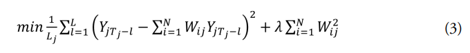 En donde son las unidades del grupo de control, l son los periodos anteriores al tratamiento para un individuo en particular y es el número máximo de los periodos antes del tratamiento de aquel individuo que tarda mayor tiempo en entrar a su respectivo tratamiento. La primera parte de la ecuación 3 es tal cual el problema del control sintético. Ben‑Michael et al. (2021) añaden diferencias en el periodo de tratamiento (subíndice l, donde las ponderaciones cambian con el tiempo dependiendo del momento de la intervención) y el último término penaliza unidades de control que no son muy informativas.