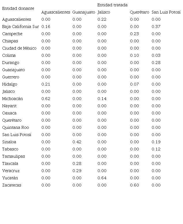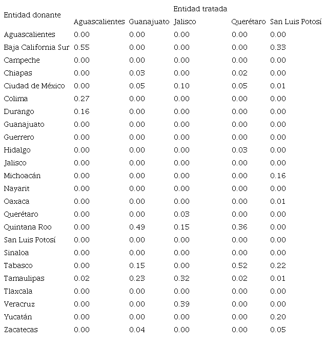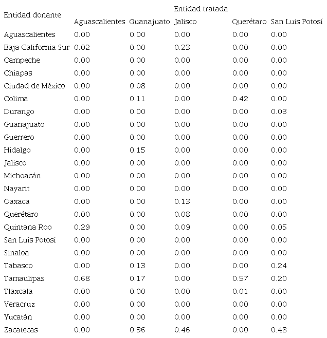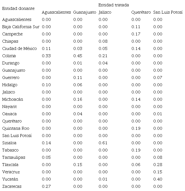 Es importante tener en cuenta que el grupo de control o de donantes incluye tanto a los territorios por fuera del Bajío,8 como a las entidades territoriales del Bajío, que aún no han sido tratadas en el momento en que otro estado de la región recibe la intervención. Es decir, Jalisco, el primer estado en recibir el tratamiento, puede tener en su grupo de donantes a todos los territorios por fuera del Bajío, al igual que los demás estados del Bajío. Sin embargo, Jalisco no puede ser control de los otros territorios que reciben el tratamiento después, debido a que cuando los demás entran al tratamiento Jalisco ya habrá sido tratado. Aunque el grupo de donantes puede variar dependiendo de la unidad tratada, los ponderadores no son dinámicos en el tiempo, es decir, los donantes son fijos en el tiempo. Lo anterior, aunque limita el número de donantes potenciales, asegura que los contrafactuales estimados no tengan variación falsa o espuria a lo largo del tiempo ante los cambios en la composición del grupo de donantes (Ben‑Michael et al., 2021).