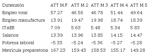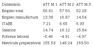 En la tercera columna el ATT se estima eliminando a los 12 estados menos similares a los tratados (en cuanto a PIB per cápita), mientras que en la cuarta columna se presenta el ATT de cada modelo eliminando a los 16 estados menos similares a los tratados (en cuanto a PIB per cápita). Fuente: elaboración propia.