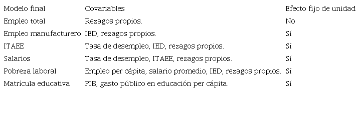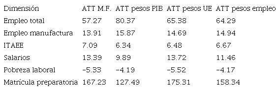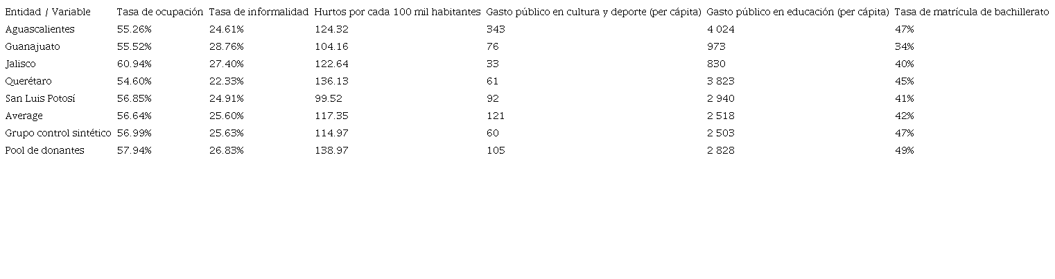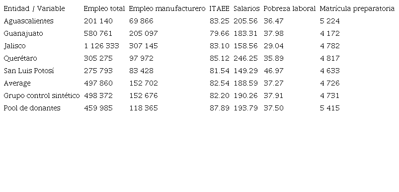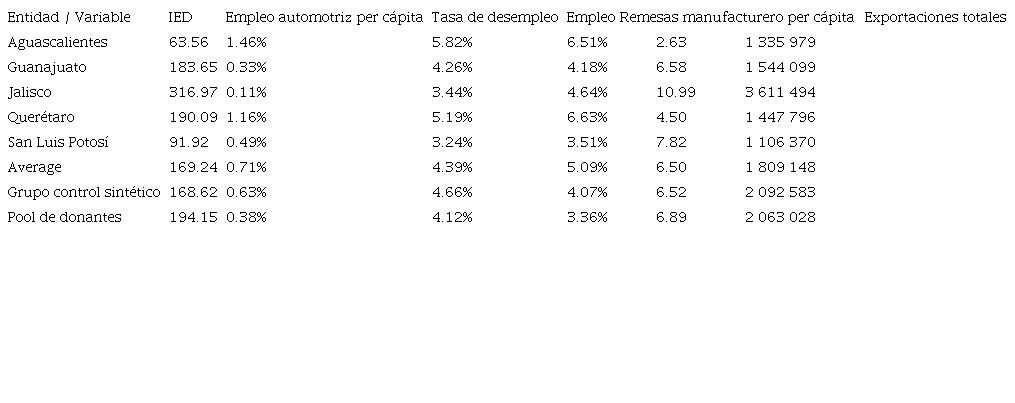 Las estimaciones municipales se encuentran en el anexo, las cuales son de utilidad para corroborar los resultados estatales y calcular los potenciales efectos derrame de la industria automotriz. De igual forma, en ese anexo se encuentra la descripción de los modelos finales, las matrices de las ponderaciones de los estados donantes para todos los controles sintéticos y las diversas pruebas de robustez. En las tablas A3, A4 y A5 del anexo se presentan tablas de balance de los promedios pretratamiento de las variables de interés y de las principales covariables para los estados tratados, para el grupo de control sintético y para el pool de donantes. A partir de ellos se puede comprobar la validez de las estimaciones al encontrar promedios similares entre entidades tratadas y donantes que hacen parte de los controles sintéticos con ponderación positiva (grupo de control sintético).