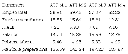 El cual, sencillamente, es el contrafactual de lo que hubiese pasado con los resultados de una variable en cuestión para una entidad tratada j, en el momento evaluado, si las plantas automotrices no se hubieran posicionado en dicha entidad. De esta forma, con los efectos de tratamiento individuales estimados se puede calcular el efecto de tratamiento promedio sobre los tratados.7
