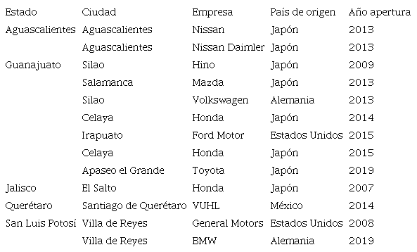 Al menos 11 plantas automotrices se posicionaron en los estados de la región del Bajío entre 2007 y 2015, lo que le permitió a la región convertirse en la zona con mayor cantidad de plantas de ensamble y de empresas proveedoras del sector en México. Por ejemplo, en 2019 más de la mitad de los vehículos ligeros fabricados en México procedieron del Bajío.