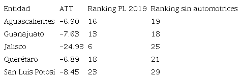 De no haber sido por las inversiones en las plantas automotrices, para 2019 todas las entidades del Bajío hubiesen tenido niveles de pobreza laboral por encima del promedio nacional. Con el concepto de contrafactual se realiza un análisis estático de lo que hubiese sucedido con el ranking de pobreza laboral (de menor a mayor), si las armadoras no se hubieran establecido en el Bajío (este análisis se resume en la tabla 2). La mayor reducción en la pobreza laboral se registró en Jalisco, que hubiese pasado de la posición 6 a la 25 en el ranking de menor pobreza laboral si las plantas automotrices no se hubiesen posicionado en su territorio. Posteriormente, se encuentran San Luis Potosí y Guanajuato, entidades que hubiesen retrocedido en seis y cinco posiciones respectivamente, y en el caso de San Luis Potosí, esta entidad se hubiese ubicado dentro de los cuatro estados con mayor proporción de personas en pobreza laboral. Finalmente, Aguascalientes y Querétaro hubiesen retrocedido en tres posiciones superando la mediana de los estados más pobres.