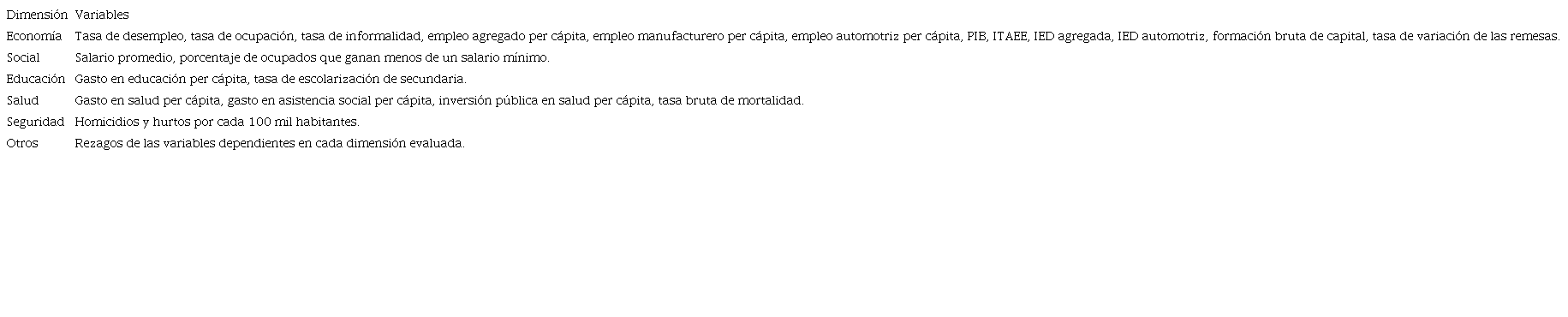 Ya que el estudio busca un análisis de desarrollo económico y social a un nivel amplio, que incluya el estudio de las condiciones de vida de la población, se usaron datos estatales a nivel trimestral para el periodo 1997‑2019, evaluando dimensiones tanto económicas como sociales. Siendo así, se estimaron los impactos de la industria automotriz sobre el desarrollo regional del Bajío mediante la evaluación de contrafactuales en indicadores de empleo (IMSS), salarios (IMSS), actividad económica (INEGI), pobreza (CONEVAL), y educación (Secretaría de Educación Pública [SEP]).