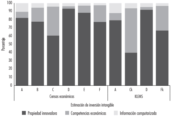 La Figura 1 muestra la estructura de la inversión de flujos intangibles de acuerdo con la clasificación de CHS. En general, la estimación vía excedente sobreestima de manera importante la participación de propiedad innovadora, y la estimación híbrida aumenta el segmento de competencias económicas. Debido a que en la literatura predominan las estimaciones híbridas, se abordarán en lo que resta del texto, en particular, en la estimación Ck de KLEMS que no incluye al segmento financiero. En esta última la competencia económica (CE), la propiedad de la innovación (PI) e información computarizada (IC) explican el 54, 40 y 6% de los flujos intangibles.