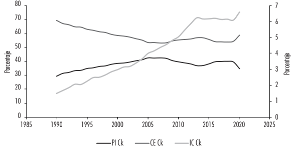 De acuerdo con la Figura 3, PI tiene un crecimiento, aunque no acelerado entre 1990 y 2005 hasta alcanzar cerca del 40% y después un estancamiento que se conserva hasta la actualidad, y como espejo, ce tiene una tendencia decreciente hasta 2005 para estabilizarse desde entonces cerca del 50%. En general, el comportamiento de la serie está en sintonía con lo observado en otras regiones: PI empieza a alcanzar a ce, pero este emparejamiento se estanca a mediados de la primera década del siglo XXI, e IC mantiene su crecimiento gradual de mayor presencia, con un posible punto de inflexión a partir de la pandemia.