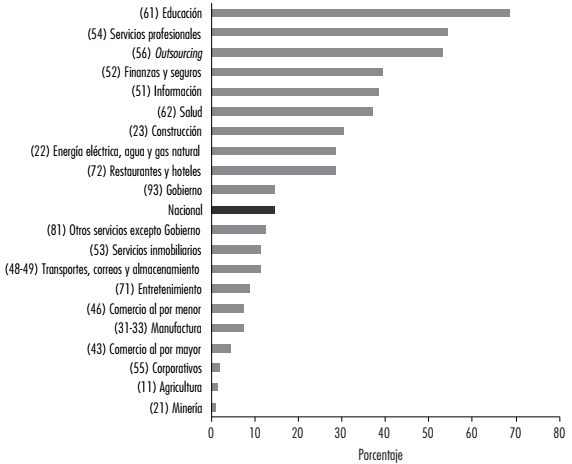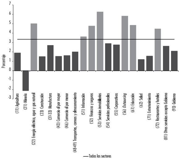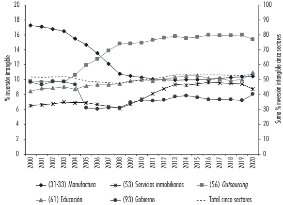 El nuevo concentrador de inversión de intangibles es el apoyo a empresas u outsourcing (56): a principios del siglo concentraba el 10% y a partir de 2008 ocupa el primer puesto con poco más de 15%. De igual forma, Servicios inmobiliarios tuvo un crecimiento importante a partir de 2008 y alcanza niveles cercanos al 10% durante los últimos años.