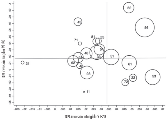 El cuadrante superior izquierdo depliega los sectores cuyas TCPA de inversión tangible se encuentran por arriba del comportamiento global, pero con tasas de inversión intangible por debajo, entre estos sectores destacan por su tamaño Manufactura (33) y Servicios profesionales (54). El primero denotando una posible sustitución de inversión intangible nacional por internacional y el segundo exhibiendo un pobre desempeño de inversión intangible en un sector que por definición es líder en producción de bienes intangibles. De igual manera, en este mismo cuadrante se encuentra el sector de Arte (71) con un mediocre desempeño de inversión intangible y una concentración de sus flujos ínfima, a pesar de ello, este sector debe ser visto como una fuente potencial de crecimiento de inversión intangible.