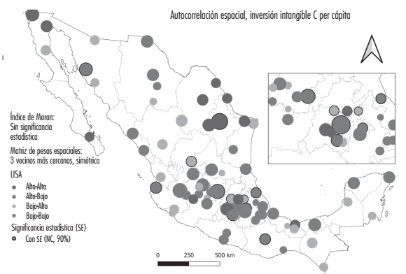 Con la finalidad de tener una aproximación a una regionalización de la inversión intangible en las zonas metropolitanas, la Figura 9 presenta los valores del diagrama de dispersión de Moran para los flujos de inversión intangible por personal ocupado para el criterio C en el año 2018. El círculo refleja el tamaño del valor de la variable en logaritmos. Se identifican cuatro patrones de aglomeración espacial de los flujos de inversión intangible: 1) Las zonas metropolitanas fronterizas del noreste y del noroeste comandadas por Monterrey y Tijuana, respectivamente, forman un clúster Alto-Alto. 2) Hay un corredor central de la ZM que conecta Guadalajara y el puerto de Veracruz, que son mayoritariamente Alto-Bajo y, en particular, en la región centro del país y del Bajío (véase recuadro) destacan las ZMVM, Cuernavaca, Puebla, Querétaro, León y Morelos denotando un índice Alto-Bajo, y a ellas se añaden Pachuca y Toluca con Alto-Alto, 3) las zonas metropolitanas integradas a corredores turísticos denotan autocorrelación Alta-Baja como Mérida, Cancún, Puerto Vallarta, Mazatlán y la Paz con Alta-Alta (es notable la excepción de Acapulco con Bajo-Bajo). Y finalmente, 4) las zonas metropolitanas de sur del país con estados colindantes al Pacífico denotando aglomeraciones Bajo-Bajo y BajoAlto.