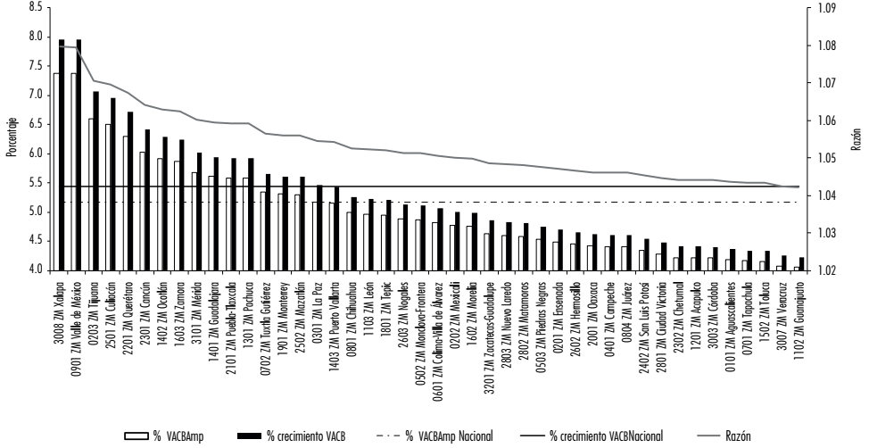 La participación de la inversión intangible, respecto al VACB ampliado, del 5.2% en 2018 indica que el VACB puede llegar a aumentar en alrededor de 5.5%, si se incluyera la inversión intangible. La Figura 9 despliega la participación de la inversión intangible respecto al VACB ampliado de las zonas metropolitanas de manera descendente y que tienen un valor mayor a 4%, también la figura despliega el porcentaje de crecimiento que tendría el VACB si se incluyera la inversión intangible estimada -columna oscura-, así como las series nacionales de las anteriores variables -series horizontales-. Son 18 zonas metropolitanas las que se encuentran por arriba o igual que el comportamiento agregado,9 ocupando los tres primeros lugares las zonas metropolitanas de Xalapa, Valle de México y Tijuana con participaciones de 7.4, 7.4 y 6.6%, respectivamente, las cuales implican a su vez un incremento del VACB de 8, 8 y 7%, respectivamente, si se incluyeran estos flujos de inversión. Es importante hacer notar que el impacto de la inclusión de intangibles al aumento en el VACB (columna oscura) no es lineal respecto a su participación (columna blanca); es decir, a una mayor participación de intangibles un mayor impacto en el aumento del VACB. Esto puede observarse con la serie con doble línea etiquetada como razón que despliega el cociente incremento porcentual del VACB entre el porcentual de intangibles respecto al VACB ampliado (con referencia en el eje derecho).