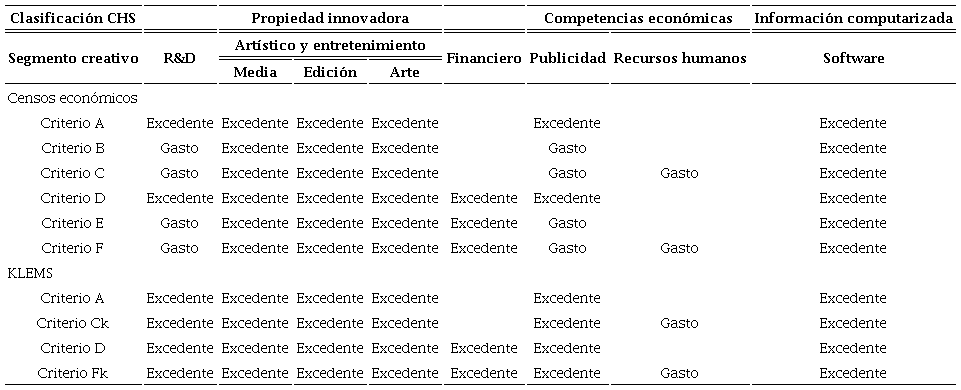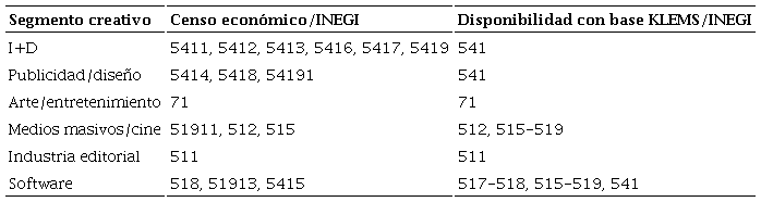 En esta investigación se utilizan dos estrategias para estimar los flujos de intangibles. La primera se le denomina vía excedente y consiste en utilizar los ingresos totales de las industrias que producen la inversión de bienes intangibles, y la segunda, es denominada vía gasto, que consiste en usar los gastos que las unidades económicas realizan en algunos rubros intangibles. A partir de ellas se generan diversos criterios de estimación tomando en cuenta dos fuentes de información: los censos económicos y la base de datos del proyecto KLEMS6 del INEGI. Estos criterios se basan en una clasificación de industrias creativas y culturales (ICC), descrita en la Tabla 1 e identificada con la clasificación del SCIAN.