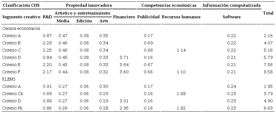 La Tabla 3 también muestra la descomposición de la participación de la inversión intangible de acuerdo a las categorías CHS y los segmentos creativos. En general, I+D tiene una presencia dominante si no se incluye el segmento financiero, de lo contrario este último tiende a concentrar de manera importante los flujos de inversión llegando a explicar hasta un 60% de los flujos en los “Criterios D” de ambas fuentes de información. Software, Edición y Arte tienen una participación muy parecida en ambas fuentes de información con alrededor de 0.22, 0.07 y 0.30%, respectivamente. Contrariamente, Media muestra una fuerte discrepancia entre censos económicos y KLEMS, ya que con el primero se tiene una sobrerrepresentación en la participación (un promedio de 0.45%), mientras con el segundo es de cerca 0.27%.