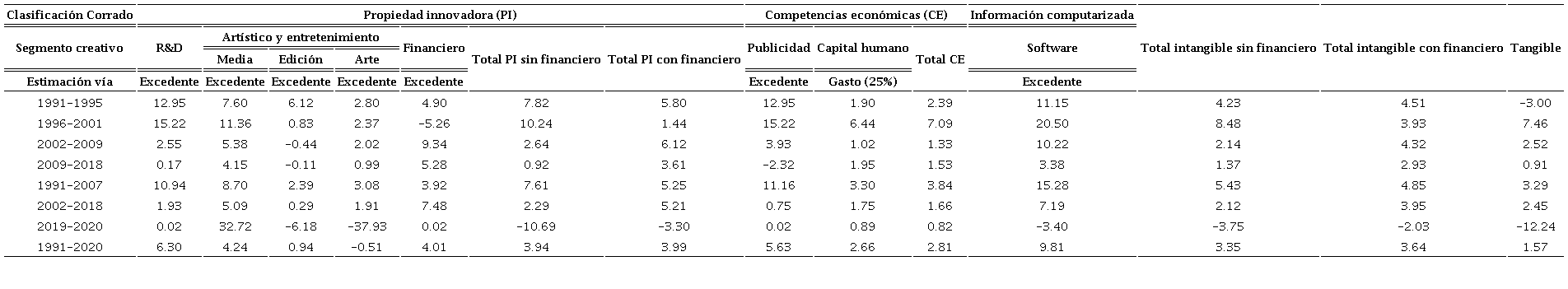 En el periodo de 30 años (1991-2020), los segmentos creativos con mayores TCPA fueron software (9.8%), R&D (6.3%) y Publicidad (5.6%); en claro contraste con los segmentos de Edición (0.94%) y, sobre todo, Arte (-0.51%), que tuvieron TCPA inferiores a la observada en la inversión tangible (1.6%). En este sentido, es importante subrayar que el segmento de Arte muestra el mayor rezago en el uso de inversión intangible.